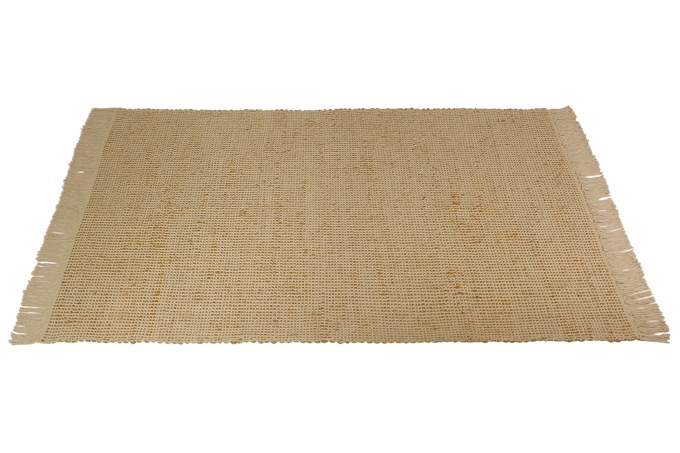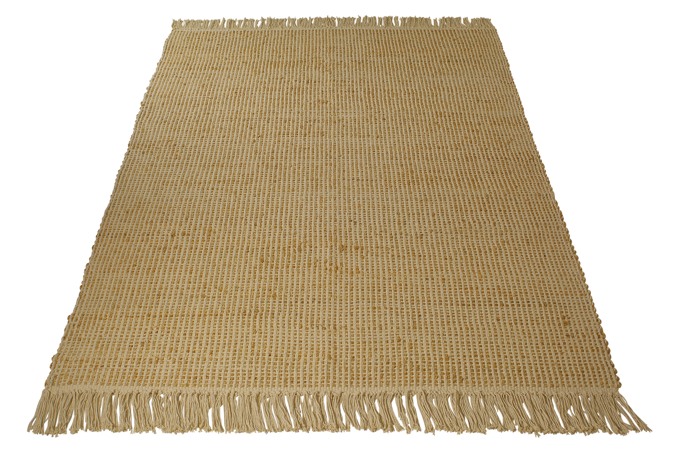 שטיח מהמם ביופיו, נארג בטכניקת שתי וערב מחבלי יוטה וחוטי כותנה עם פרנזים מושלמים.